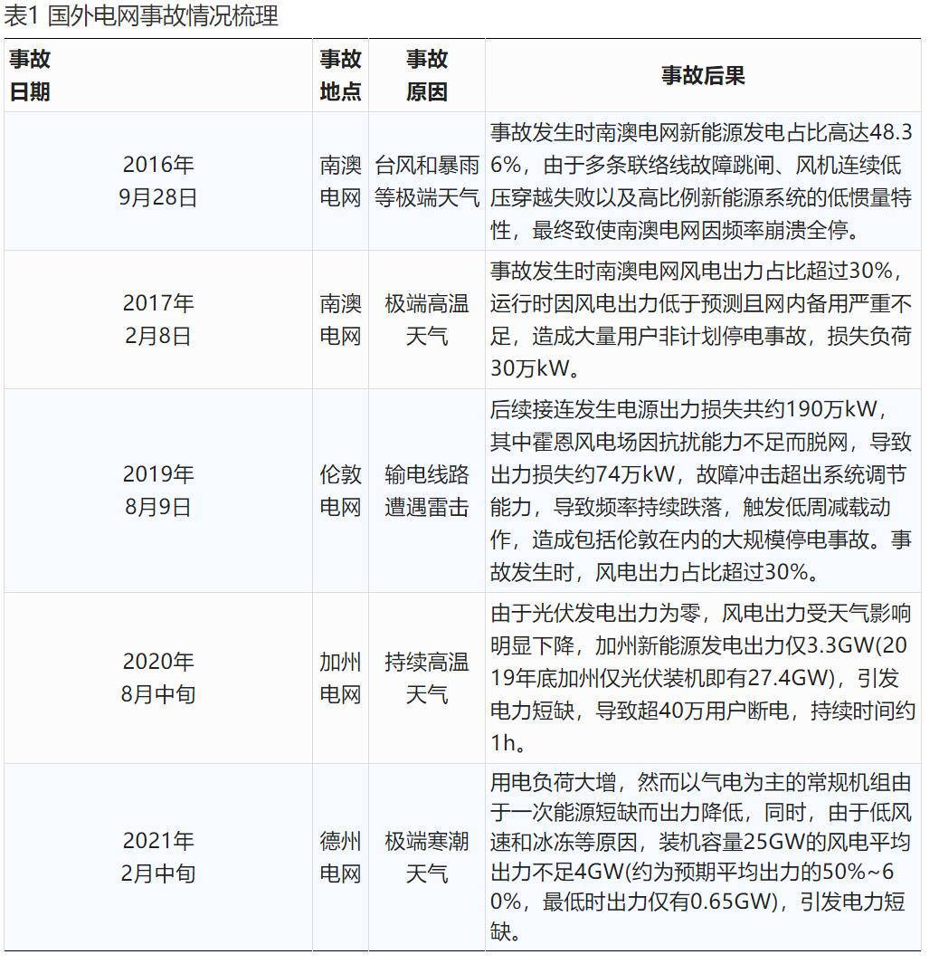 受(shou)資(zi)源(yuan)約(yue)束(shu)的電(dian)(dian)(dian)(dian)(dian)(dian)源(yuan)(限(xian)能(neng)(neng)(neng)電(dian)(dian)(dian)(dian)(dian)(dian)站(zhan))向(xiang)上調(diao)峰(feng)能(neng)(neng)(neng)力(li)(li)(li)的發揮除了(le)跟(gen)機組自身調(diao)峰(feng)能(neng)(neng)(neng)力(li)(li)(li)有(you)關(guan)外(wai),還與資(zi)源(yuan)決定(ding)的發電(dian)(dian)(dian)(dian)(dian)(dian)量密切(qie)相關(guan),不同電(dian)(dian)(dian)(dian)(dian)(dian)源(yuan)的向(xiang)上調(diao)峰(feng)能(neng)(neng)(neng)力(li)(li)(li)存在(zai)較大(da)(da)差異(yi)。如水(shui)電(dian)(dian)(dian)(dian)(dian)(dian)最(zui)大(da)(da)出(chu)(chu)力(li)(li)(li)理論上可以(yi)達到預想出(chu)(chu)力(li)(li)(li),但(dan)實際往往受(shou)來水(shui)約(yue)束(shu)不能(neng)(neng)(neng)達到上述(shu)最(zui)大(da)(da)值,比(bi)如青海水(shui)電(dian)(dian)(dian)(dian)(dian)(dian)冬季受(shou)來水(shui)影響最(zui)大(da)(da)出(chu)(chu)力(li)(li)(li)僅為其裝機的50%~70%;儲能(neng)(neng)(neng)電(dian)(dian)(dian)(dian)(dian)(dian)站(zhan)在(zai)系統(tong)電(dian)(dian)(dian)(dian)(dian)(dian)量不足時也難(nan)以(yi)發揮作用;光熱電(dian)(dian)(dian)(dian)(dian)(dian)站(zhan)類似,在(zai)太陽(yang)能(neng)(neng)(neng)資(zi)源(yuan)不好時,最(zui)大(da)(da)出(chu)(chu)力(li)(li)(li)也會受(shou)限(xian)。因(yin)此,隨(sui)著新型(xing)電(dian)(dian)(dian)(dian)(dian)(dian)力(li)(li)(li)系統(tong)中限(xian)能(neng)(neng)(neng)電(dian)(dian)(dian)(dian)(dian)(dian)站(zhan)逐步(bu)增加(jia),其參加(jia)電(dian)(dian)(dian)(dian)(dian)(dian)力(li)(li)(li)平(ping)衡能(neng)(neng)(neng)力(li)(li)(li)不足,再(zai)加(jia)上季節性資(zi)源(yuan)不平(ping)衡,電(dian)(dian)(dian)(dian)(dian)(dian)力(li)(li)(li)系統(tong)將面臨電(dian)(dian)(dian)(dian)(dian)(dian)力(li)(li)(li)保障缺乏穩(wen)定(ding)電(dian)(dian)(dian)(dian)(dian)(dian)源(yuan)支(zhi)撐的嚴峻形勢。國外(wai)電(dian)(dian)(dian)(dian)(dian)(dian)網事(shi)故情(qing)況梳理見表1。