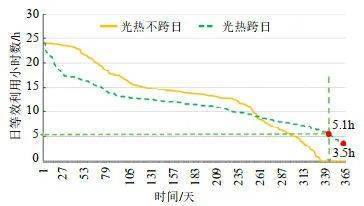 表2給出(chu)了海西地(di)區(qu)光(guang)(guang)熱(re)(re)電(dian)站(zhan)(zhan)(zhan)替代(dai)火(huo)電(dian)裝(zhuang)機(ji)比例測(ce)(ce)算結果。圖(tu)4給出(chu)了海西烏圖(tu)地(di)區(qu)光(guang)(guang)熱(re)(re)電(dian)站(zhan)(zhan)(zhan)日等(deng)(deng)效(xiao)(xiao)小(xiao)時(shi)(shi)數分布示意圖(tu)。可(ke)以看出(chu),根據(ju)前(qian)面方法(fa)測(ce)(ce)算,按(an)95%保(bao)(bao)證(zheng)(zheng)率(lv)(lv),不考(kao)慮跨(kua)(kua)日調(diao)(diao)節(jie),光(guang)(guang)熱(re)(re)電(dian)站(zhan)(zhan)(zhan)日等(deng)(deng)效(xiao)(xiao)保(bao)(bao)證(zheng)(zheng)小(xiao)時(shi)(shi)數為0,基本(ben)不能參加電(dian)力(li)平(ping)衡,即(ji)無(wu)法(fa)替代(dai)火(huo)電(dian)裝(zhuang)機(ji);光(guang)(guang)熱(re)(re)電(dian)站(zhan)(zhan)(zhan)儲(chu)熱(re)(re)時(shi)(shi)長15h(即(ji)儲(chu)熱(re)(re)容(rong)(rong)量可(ke)以支撐光(guang)(guang)熱(re)(re)電(dian)站(zhan)(zhan)(zhan)滿(man)發(fa)15h),根據(ju)天氣及(ji)出(chu)力(li)預測(ce)(ce)事(shi)先安排一(yi)定容(rong)(rong)量進行跨(kua)(kua)日調(diao)(diao)節(jie),考(kao)慮跨(kua)(kua)日調(diao)(diao)節(jie)后光(guang)(guang)熱(re)(re)電(dian)站(zhan)(zhan)(zhan)日等(deng)(deng)效(xiao)(xiao)保(bao)(bao)證(zheng)(zheng)小(xiao)時(shi)(shi)數為5.1h,可(ke)滿(man)足(zu)晚高峰負荷4h需求,全(quan)容(rong)(rong)量參加電(dian)力(li)平(ping)衡,完全(quan)替代(dai)相同(tong)容(rong)(rong)量火(huo)電(dian)裝(zhuang)機(ji)。若按(an)100%保(bao)(bao)證(zheng)(zheng)率(lv)(lv),光(guang)(guang)熱(re)(re)電(dian)站(zhan)(zhan)(zhan)日等(deng)(deng)效(xiao)(xiao)保(bao)(bao)證(zheng)(zheng)小(xiao)時(shi)(shi)數為3.5h,參加電(dian)力(li)平(ping)衡比例(火(huo)電(dian)容(rong)(rong)量替代(dai)率(lv)(lv))約(yue)87.5%。