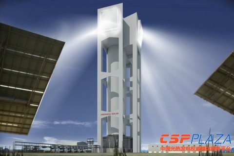 Khi Solar One項目裝機50MW,其采用更高溫更高效的集熱塔設計方案,配置空冷系統。Khi Solar One塔式電站設計有3個腔式吸熱器,對應三個分光場系統,總計采用4120套定日鏡系統,單套定日鏡采光面積120平方米。東邊的鏡場聚焦于一個腔式吸熱器,其上安裝有飽和蒸汽發生器。西部的鏡場聚焦于一個腔式吸熱器,其上安裝一個過熱器。控制系統可調節部分處于特殊位置的定日鏡系統使其根據需要聚焦于不同的吸熱器,以優化電力生產。Khi Solar One的儲熱采用水蒸氣儲熱,與PS10和PS20類似,在數個儲熱罐中安裝19個蒸汽存儲器,可提供2~3個小時的夜間發電。