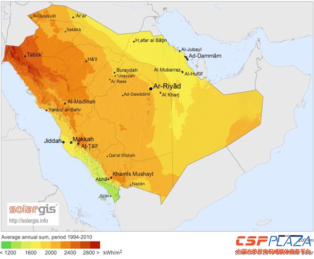 圖:Solargis顯示的沙特(te)太(tai)陽能資源分布