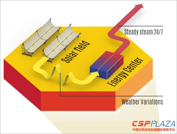 與傳統的槽式光熱發電技術的不同之處在于,光場系統吸收的熱量全部進入能源中心進行再次處理,以實現穩定的蒸汽輸出,從而實現穩定的電力輸出。對于能源中心具體的內部組成,尚有待了解。