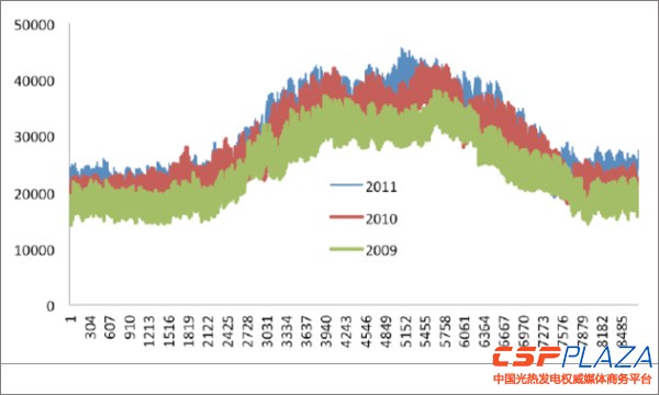 沙特的電力需求自2002~2011年間的年增速超過70%,沙特當前80%左右的電力消耗用于民用電。沙特2009~2011年三年間的逐時電力負荷簡表見表一,夏季由于空調耗電量劇增,達到全年的電力需求峰值。從基礎負荷上增加的用能需求主要是由于高峰電力負荷和中間負荷需求的增加。