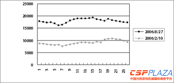 圖表2記錄了沙特2006年夏季和冬季的某一天典型的日負荷曲線,從圖表2可見,夏季的基礎負荷電力需求幾乎是冬季基礎負荷電力需求的2倍。夏季的電力需求高峰在一天中出現兩次,一次出現在中午11點到下午三點之間,此時是全天中空氣溫度最高最熱的時候,電力需求量達到頂峰;第二次電力需求高峰則出現在晚上19點,此時雖然氣溫已有所下降,但居民因多在家中,耗電需求依然很大。兩次電力需求高峰的主要原因都是空調耗電。