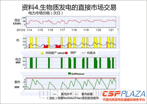 資料4表示了RegModHarz項目中,在進行直接買賣的情況下,生物燃氣熱電聯產系統和生物燃氣鍋爐的運轉情況。第1排是次日電力市場的價格變化,第2排是熱能的供需變化,第3排是電能的供需變化,第4排是蓄熱的容量和水平。企業要根據電力價格、熱需求、蓄熱設備的使用情況等因素,決定熱電聯產系統和鍋爐的最佳運轉方式。