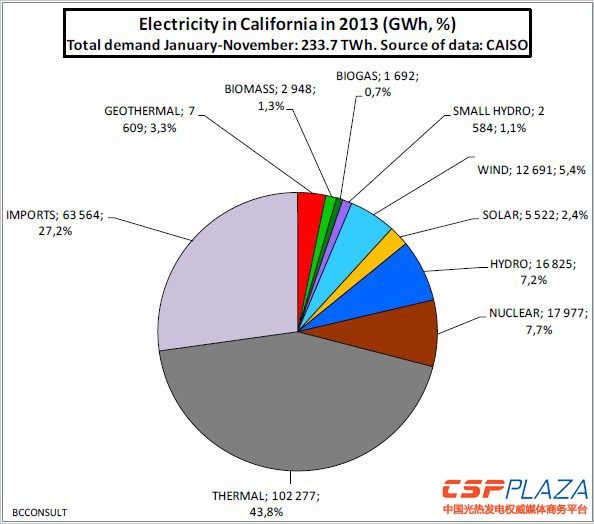 CSPPLAZA光熱發電網訊:可再生能(neng)源咨詢公司Bernard Chabot日前發(fa)布(bu)了加州(zhou)太陽能(neng)和風(feng)電產能(neng)的最新分析報告(gao),報告(gao)指出,光伏發(fa)電滿足了2013加州(zhou)年度電力需求(qiu)的2.08%,光熱發(fa)電滿足了0.28%。