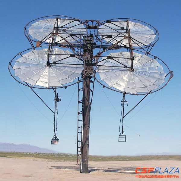一個集熱塔配置四面反射鏡,各自對應一個熱量接收器。其熱量集熱器類似于一(yi)個光漏斗(dou),對(dui)聚集后的(de)光線(xian)進行再次(ci)聚集,從而(er)提(ti)高集熱溫(wen)度。