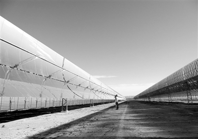 2013年9月,在內蒙古巴音淖爾市烏拉特中旗一片遼闊而荒蕪的草原上,兩條共長600米的標準槽式光熱發電集熱回路,在耀眼的陽光下熠熠閃動著魔幻般的藍光。笨拙的重達124噸的集熱系統裝置在四組液壓驅動的作用下,以誤差不超過2mard的精度敏銳和精確地追隨著太陽光線的變動,3500平方米面積的陽光被準確地聚焦在寬度125毫米、長度600米真空集熱管上。導熱油循環啟動,在真空集熱管中流過,溫度被加熱到393℃并最終送至冷卻裝置,空冷系統的風扇急切地吹動,熱浪在空氣里一浪一浪地向四周彌漫。兩位來自德國宇航中心(DLR)的專家在緊張有序地忙碌著,檢查、測試、計量、記錄、統計、分析。一周的時間后,德國宇航中心(DLR)給出了測試結論:該槽式集熱場在功率和效率測試中表現優異,相當于在以合成導熱油為傳熱流體,在商業電站的典型運行工況下,光熱轉換效率達67.1%,此結果與Euro-Trough聚光集熱系統在西班牙PSA測試結果一致,該回路總的性能達到了世界上大規模CSP項目中使用類似聚光器設計的聚光集熱系統性能水平。