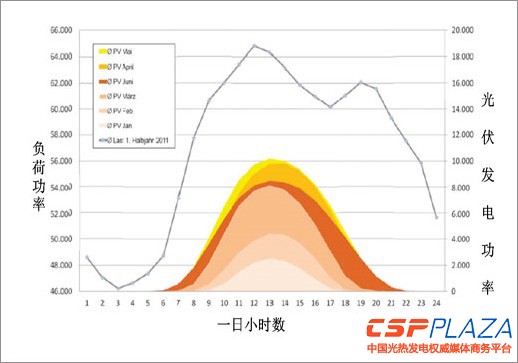 德國用電負荷功率(黑線)和光伏發電功率(彩色顏色表示不同月份)圖