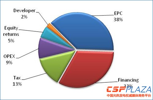 基于高融資需求,融資條件對光熱電站的經濟性起到關鍵影響,項目開發商必須對此給予認真核算。融資成本在光熱電站的整體成本構成中占據重要份額,并影響項目方可以實現和出售電力的PPA電價。融資成本的影響與光熱發電項目的初始建設投資額度一樣重要。下面的圖表呈現的是一個由光熱電站的PPA電價構成分解情況。其中PPA的1/3由融資成本構成(包括項目建設和運營中的債務利息支出)。而電站建設的大頭EPC成本僅占比在38%左右。
