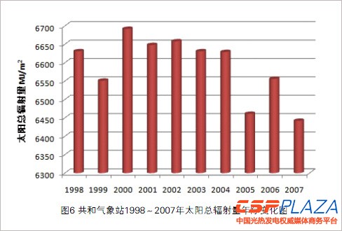 圖5是德令哈氣象站1998~2007年的太陽總輻射量年際變化,年平均太陽能總輻射量為6640MJ/m2。圖6是共和氣象站1998~2007年的太陽總輻射量年際變化,年平均太陽能總輻射量為6589MJ/m2。