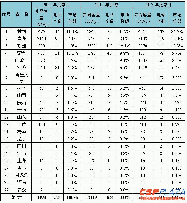 光伏電站。截至2013年底,全國22個主要省(自治區、直轄市)已累計并網741個大型光伏發電項目,主要分布在我國西北地區。累計裝機容量排名前三的(de)省(sheng)份分別為甘肅省(sheng)、青海省(sheng)和(he)新疆(jiang)自(zi)治區,分別達(da)到432萬(wan)千(qian)瓦、310萬(wan)千(qian)瓦和(he)257萬(wan)千(qian)瓦,三省(sheng)(區)之和(he)超過全國光(guang)伏(fu)電站總量的(de)60%。各省(自治區、直(zhi)轄市)光(guang)伏電站裝(zhuang)機情況(kuang)見附(fu)表(biao)1。