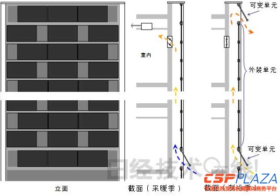 在氣溫較低的冬季,可以只打開下面的可變部分,向室內導入加熱后的空氣,加熱空氣利用的是正在發電的光伏電池板背面產生的熱量,由此可將制暖負荷削減約48%。