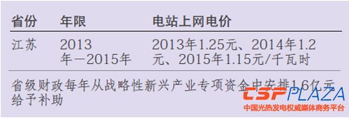 在國家統一上網電價基礎上,江蘇省加大了光伏發電電價附加補助力度,明確2012-2015年期間,對全省新投產的非國家財政補貼光伏發電項目,實行地面、屋頂、建筑一體化。