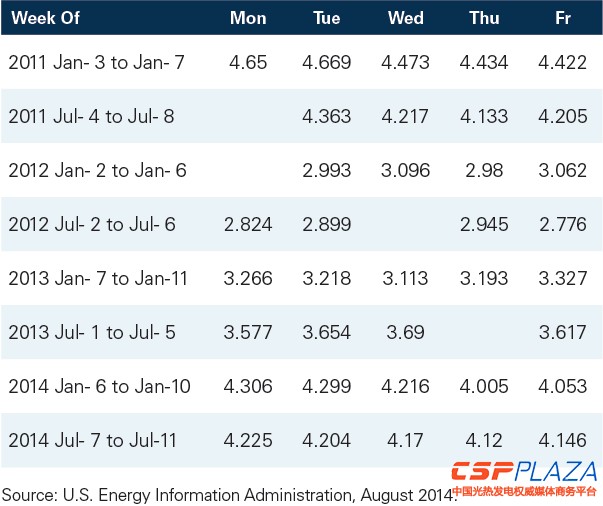 EIA報告顯示天然氣價格在過去幾年總體呈增長態勢,下表是Henry Hub天然氣現貨在過去四年的價格,其提供了自2011年以來的一月和七月首周的天然氣價格作為參考。