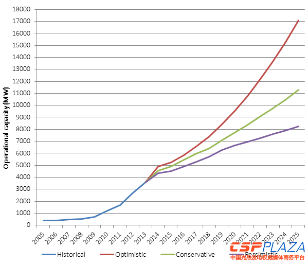 但人們對光熱發電技術的信心在顯著增強,據海外光熱發電信息研究機構CSPToday預測,在未來十年內,全球光熱發電的運行裝機將在2013年3565MW的基礎上至少翻一倍還多。在悲觀、中立、樂觀三種情景模式猜想下,2025年全球光熱發電裝機容量有望達到8240MW~17100MW的規模。
