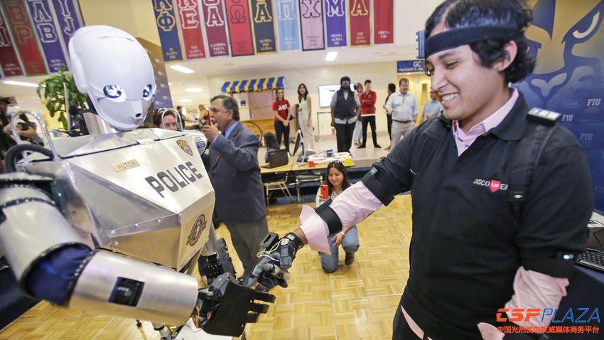 佛羅里達國際大學探索實驗室(DiscoveryLab)組成了一支本科生研究團隊,這支團隊后來研發出一個6英尺高、75磅重的機器人原型。這位名叫“Telebot”的機器人能夠幫助殘疾警官和軍事人員繼續擔當巡邏人員。Telebot配備了目前非常熱門的OculusRift增強現實裝置,將遠程控制技術與機器人技術結合在一起,可以通過特殊的穿戴裝置和手套來遠程控制機器人的動作,并且還能通過OculusRift和專用耳機接收Telebot所看到和聽到的信息。