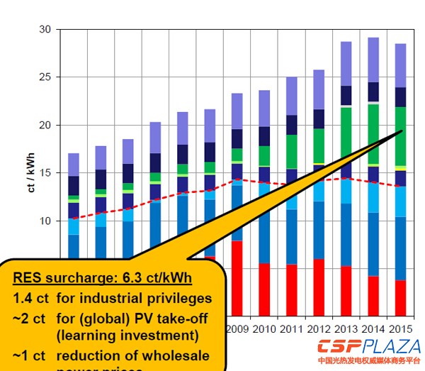 背景:可再生能源附加費是用來支付可再生能源發電收購電價超過市場電價的差額。在2000年前后,德國開始征收附加費,由每千瓦時不足1歐分,到2015年增至每千瓦時6.3歐分。