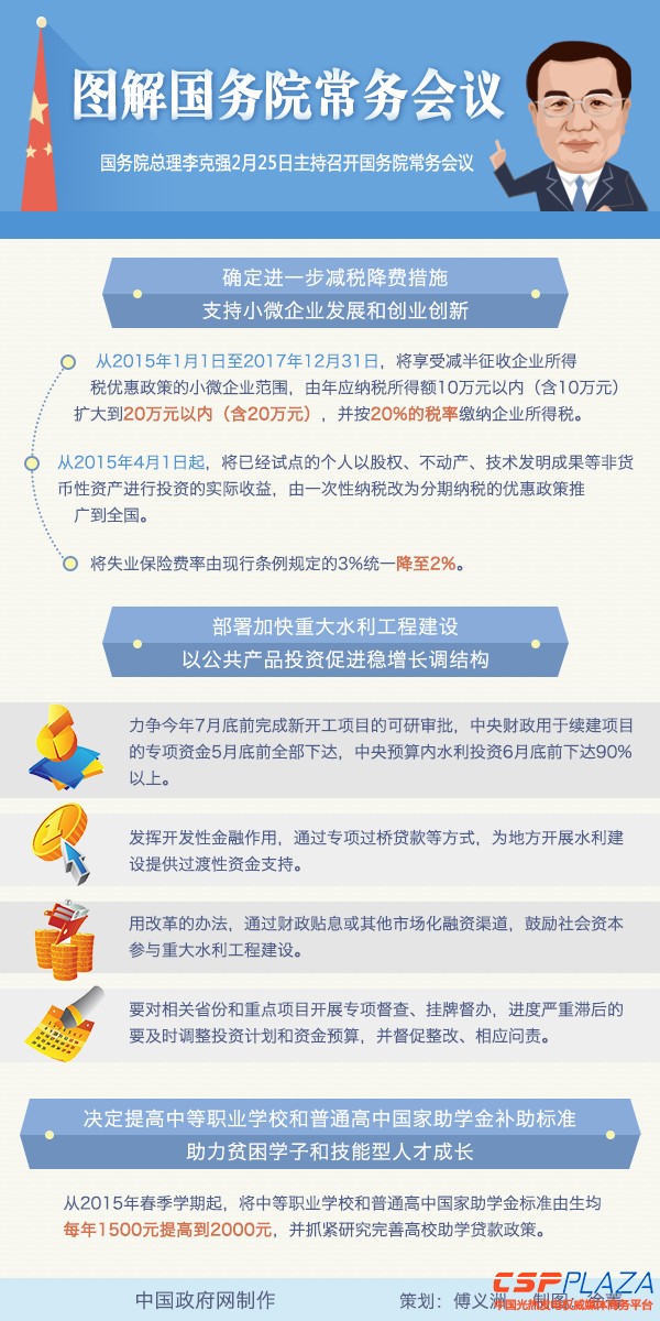 國務院總理李克強2月25日主持召開國務院常務會議,確定進一步減稅降費措施、支持小微企業發展和創業創新,部署加快重大水利工程建設、以公共產品投資促進穩增長調結構,決定提高中等職業學校和普通高中國家助學金補助標準、助力貧困學子和技能型人才成長。