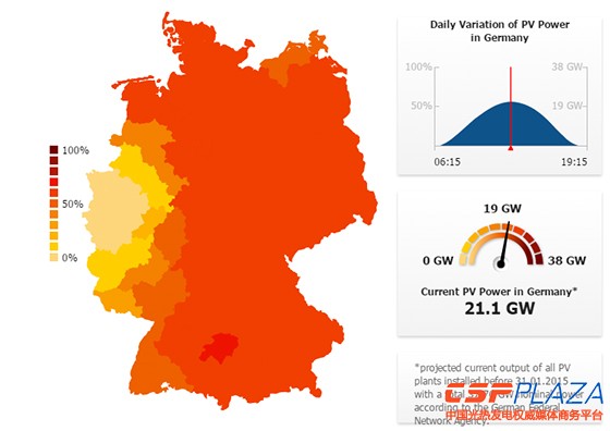 當地時間3月20日12時45分,德國日照圖,太陽能發電量達21.1GW