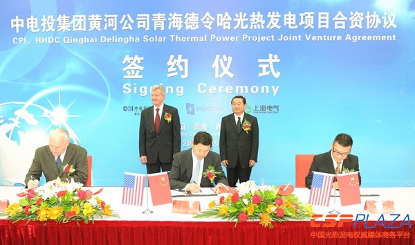 5月25日,在青海省省長郝鵬與美國駐華大使馬克斯.西本.博卡斯見證下,公司董事長、黨組書記謝小平與美國亮源能源公司董事長大衛.拉姆,上海電氣亮源光熱工程有限公司總經理畢成業,在青海勝利賓館共同簽署了建設德令哈光熱發電項目的協議。協議的簽署,將對改變青海的電源結構,開啟節能減排的綠色時代,具有十分重要的意義。