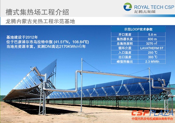 槽式集熱場工程,今天我們的主題就是“槽式集熱場EPC如何對接國際水準”。在這里我首先介紹一下我們公司在2012年關于槽式集熱場集成在內蒙所做的工作。內蒙基地正式于2012年開始建設,位于巴林淖爾,具體方位為東經108.84度,北緯41.51度。當地的光資源比較豐富,我們實測DNI的最高值達到了2170KWh/㎡/年。整體而言,我們在內蒙綠能公司前期與千年合作中的17個選址當中選擇了比較好的一個點。當時我們建設示范工程的技術參數選擇了標準的RP3 600米槽式回路的方式,建設了一條標準的槽式電站的回路,導熱介質是ST導熱油,是聯苯和聯苯醚的混合物,出口跟進口溫度是按照槽式電站的標準工況設定。