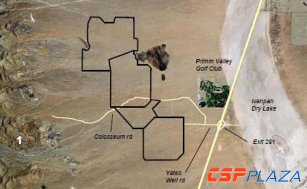 如上圖為鳥瞰圖,項目的場址在拉斯維加斯南部45英里的地區,在一個河床地區。光熱電站的布局,我們討論的話題是太陽能電站的EPC,項目的布局是不規則的。從鳥瞰的角度來看,很明顯是呈不規則的光場布局。布局在設計的時候考慮到了當地的地形,最終決定設計光場的布局。我們可以看到在這個地區也有一個車道,為了能夠幫助施工以及清潔人員到光場中去進行清潔工作。