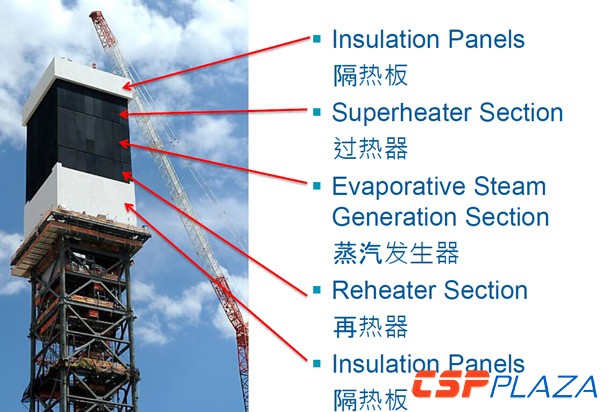 接下來我會給大家展示一下吸熱鍋爐。大家可以看到在塔頂有一個隔熱板,這個設施在設計的時候也有單一的再熱循環,最上面有一個過熱器在鍋爐的上面,還有一個蒸汽發生器在中間,在底下有一個再熱器,是由三個部分組成。這樣的設置可以增加效率,進行再熱設計的時候,這樣的設計也能夠提供另外的參數去控制過熱器,但是也不會導致效率的降低,還會改善效率。