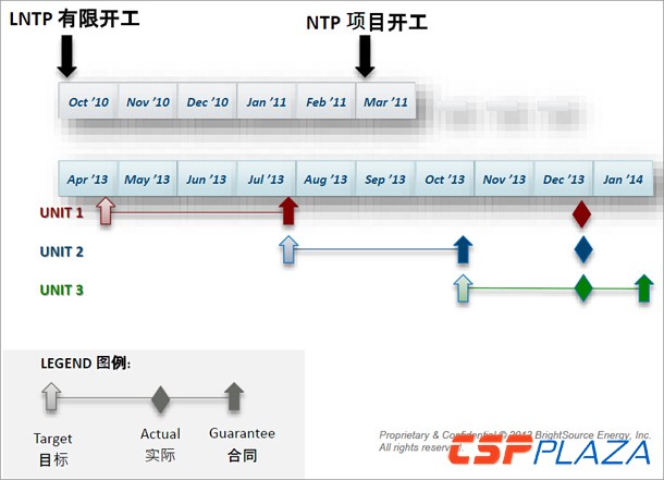 毫無疑問除了在常規的光場上所要開展的工作以外,有中間常規的光場,除此以外還需要有更新的技術需要去安排,整個項目進度安排,如圖,紅色的箭頭,這是第一個發電單元,在2011年3月份已經開始了,對第一個發電單元保證的日期是2013年7月份。紅色菱形顯示的是實際完工的時間,2013年12月份,對第一個發電單元來說就延遲了五個月的時間,第二個發電單元比保證的時間晚了兩個月的時間,第三個發電單元提前了一個月。有一個非常明顯的學習的過程,在EPC建設施工以及調試的過程中,在這三個發電單元之間有一個明顯的學習過程。