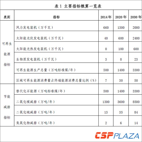 具體指標包括,到2020年,可再生能源發電裝機規模達到2000萬千瓦,年發電量達到400億千瓦時以上,年替代化石能源1400萬噸標準煤,減少二氧化碳、二氧化硫、氮氧化合物排放分別約3600萬噸、35萬噸和6萬噸;到2030年,可再生能源發電裝機規模達到5000萬千瓦,年發電量達950億千瓦時以上,年替代化石能源3300萬噸標準煤,減少二氧化碳、二氧化硫、氮氧化合物排放分別約8500萬噸、84萬噸和14萬噸。