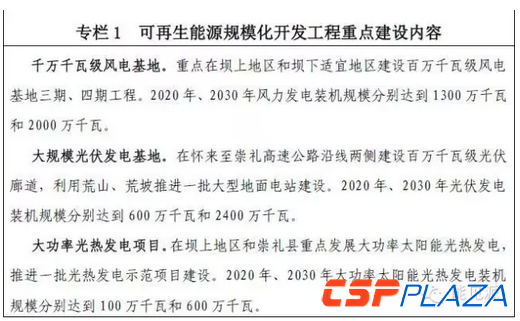 因地制宜建設太陽能光伏(熱)開發應用基地。充分發揮壩上地區面積廣袤、太陽能資源富集優勢,利用荒山、荒坡推進一批大型地面電站建設;遵循“綠色奧運、低碳奧運”的承辦理念,支持大型光伏企業在懷來至崇禮高速公路沿線兩側建設百萬千瓦級光伏廊道,啟動北京—張家口高速公路(張家口段)光伏電站及分布式儲能試點建設;探索通過擴大新能源應用促進區域工業綠色轉型發展試點工作;在各類產業聚集區,以及公共建筑、商業樓宇、居民社區、農村等區域,大力發展分布式光伏發電、風光互補,在城區全面實行綠色建筑標準,積極發展被動式超低能耗綠色建筑;著力推廣太陽能光伏農牧業,實現“光農”、“光牧”互補;積極實施國家光伏扶貧工程,在赤城縣先行先試,總結經驗后在示范區內推廣;快速推動尚義縣集光電、生態、旅游、度假為一體的大型太陽能示范園區建設。在壩上地區重點發展大功率太陽能光熱發電,重點推進一批光熱發電示范項目建設。