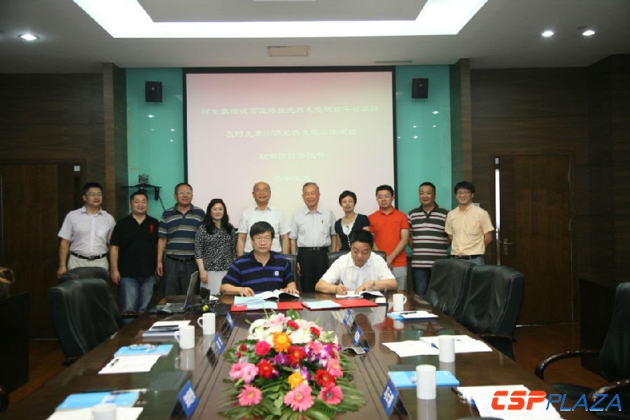 2015年8月12日,國內首座槽式高溫熔鹽光熱發電項目“甘肅光熱發電有限公司阿克塞槽式高溫熔鹽光熱發電試驗平臺及阿克塞50MW光熱發電工程”的勘測設計合同簽字儀式在西安舉行。天津濱海光熱發電投資有限公司首席執行官馬云青、甘肅光熱發電有限公司總經理胡建輝及我公司黨委書記鄭舒貴、計劃發展與法律事務部、新能源開發分公司負責人等領導出席了簽字儀式,胡建輝總經理和我公司新能源開發分公司負責人代表雙方在合同上簽字。