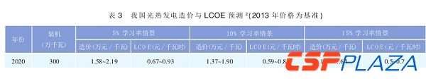 學習率為5%時,2020年,光熱發電造價將降至1.58~2.19萬元/千瓦,LCOE將降至0.67~0.93元/千瓦時;學習率為10%時,光熱發電造價將降至1.37~1.90萬元/千瓦,LCOE將降至0.59~0.81元/千瓦時;學習率為15%時,光熱發電造價將降至1.18~1.64萬元/千瓦,LCOE將降至0.5~0.7元/千瓦時。