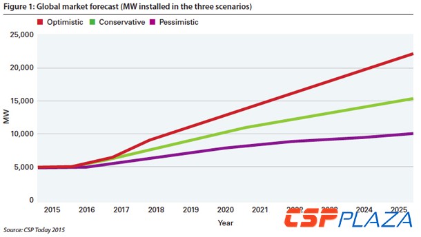 圖:CSPToday預測的全球光熱發電裝機量變化曲線(2015-2025)