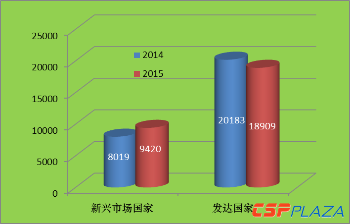 圖4 2014、2015“500強”發達國家與新興市場國家上榜企業總營業收入(單位:億元)