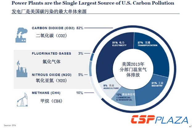 根據美國環境保護署EPA的數據分析,當前,發電廠仍是美國碳污染的最大單體來源。其中,二氧化碳所占污染源比重最高,約82%。氟化氣體占3%,氧化亞氮占5%,甲烷占10%,交通占27%,工業占21%。