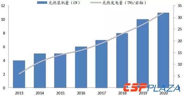 國際能源署認為光熱電站裝機未來將持續上升,預測到2020年全球光熱發電裝機量將達到11GW左右。