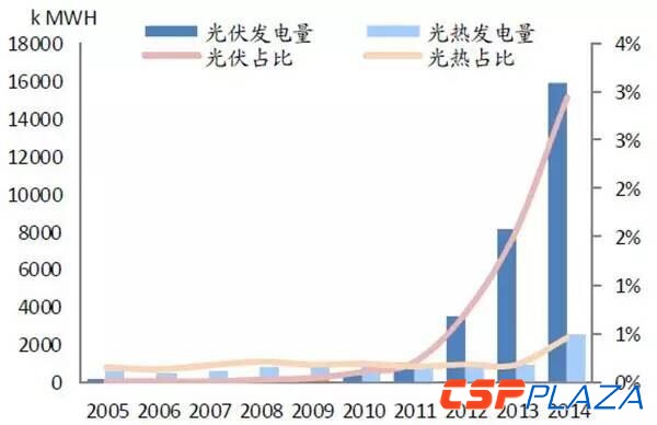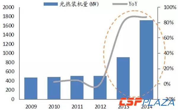 全球光熱裝機量在各國補貼優惠政策的支持下呈現高速增長,過去5年內全球光熱裝機量復合增速達到47%,據統計至2014年底全球光熱裝機總量約為4.5GW。
