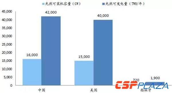 我國潛在的光熱可裝機容量理論上可以達到16,000GW,超過目前世界上光熱裝機量最大的國家美國和西班牙。