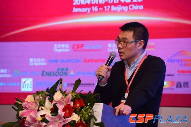 CSPPLAZA光熱發電網報道:由中國光熱發電行業唯一的專業媒體商務平臺CSPPLAZA主辦、首航光熱聯合主辦、中控太陽能、江蘇太陽寶和百吉瑞新能源聯合協辦,中海陽贊助晚宴的以“示范熱潮下的通力協作”為主題的中國光熱示范項目開發全產業鏈合作峰會暨CSPPLAZA2016新年匯于1月16日~17日在京盛大召開!中控太陽能技術有限公司副總工程師徐能出席本屆大會并發表演講。