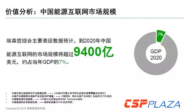 簡言之,中國在高比例情景下的可再生能源相關產業鏈增加值、物聯網在有利政策推進下為能源產業創造的GDP增量、國內微網市場可預期的大規模增長,以及全國在新能源供應和能源效率方面的新增投資,到2020年會共同聚合為巨大增量市場:屆時中國能源互聯網的總市場規模將超過9400億美元,約占當年GDP的7%。