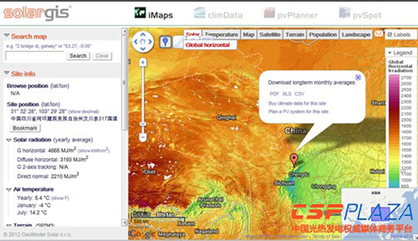 SolarGIS是由歐洲GeoModelSolars.r.o.開發的太陽能評估和規劃交互式工具,以其250米分辨率的高精度得到了業內人士的廣泛認可,國內40余家投資商及科研設計單位已將SolarGIS應用于光熱光伏項目的前期開發、資源評估和發電量計算。