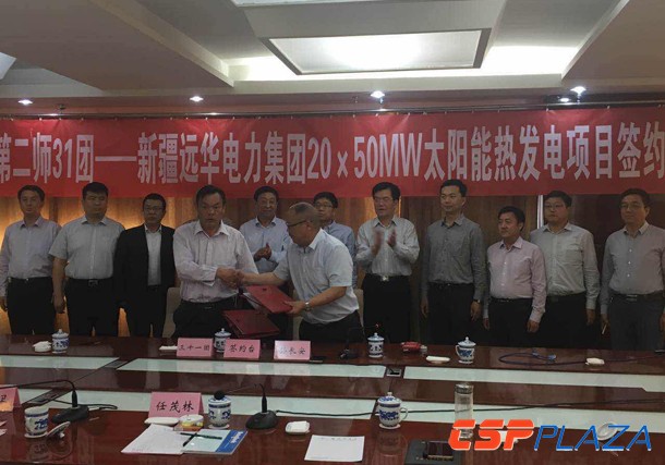 CSPPLAZA光熱發電網訊:4月27日下午,新疆生產建設兵團第二師三十一團與新疆遠華電力(集團)公司(以下簡稱“遠華電力”)舉行了20×50MW光熱發電項目的簽約儀式,針對裝機總量高達1GW的光熱發電項目,雙方共同簽署了項目投資協議書。
