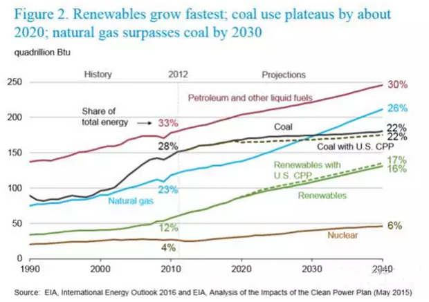 (可再生能源使用量增長迅速;大約到2020年,煤炭使用量會進入平穩期;到2030年,天然氣使用量會超過煤炭使用量)