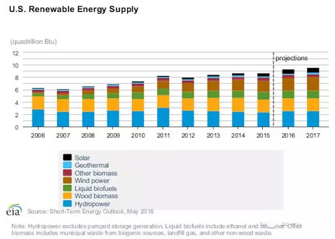 到2040年,煤炭、天然氣和可再生能源的發電量會大致相同(28%-29%),這會是一巨大變化。美國能源信息管理局(EIA)公布的2016年國際能源展望(InternationalEnergyOutlook2016)報告稱,煤炭現有發電量占到40%。可再生能源是目前世界上發電貢獻增長率最快的能源,預計至2040年期間,以每年2.6%的速率增加。報告指出,水電和風能是全球發電量增加的最大貢獻者。從2013年到2040年,水電和風能占可再生能源發電量的2/3。