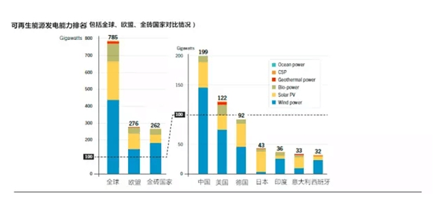 報告將各國全球可再生能源發電容量進行了排名,其中中國以199GW排名第一,美國、德國分別以122GW、92GW位居第二和第三。