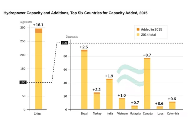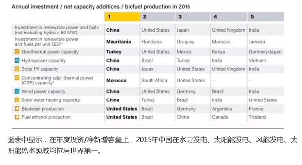 圖表中顯示,在年度投資/凈新增容量上,2015年中國在水力發電、太陽能發電、風能發電、太陽能熱水領域均位居世界第一。