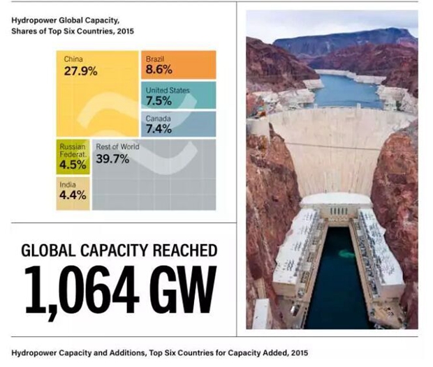 在總發電量方面,截至2015年末,中國在水力發電、水力容量、太陽能容量、風能容量、太陽能熱水容量、地熱能容量上均位居世界第一。