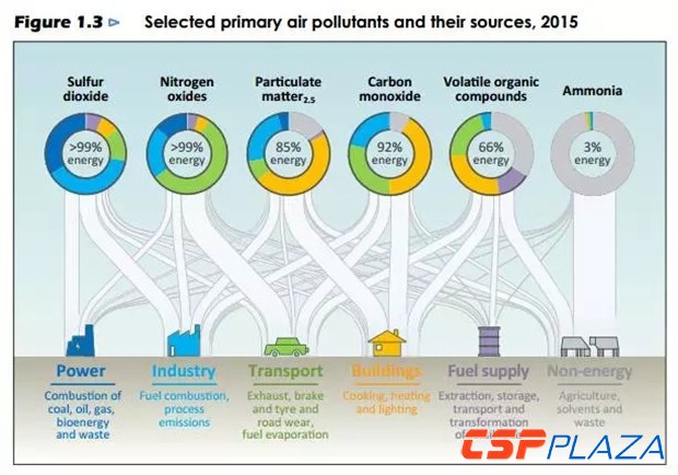 IEA的報告認為,能源生產和使用,尤其是不受監管、不規范的或低效率的燃料燃燒,是目前主要的人為空氣污染的來源——85%的顆粒物和幾乎所有的硫氧化物和氮氧化物都來源于此。經濟不發達地區使用木柴和其他固體燃料進行的炊事活動,以及化石燃料密集型發展和城市化都不同程度的加重了空氣污染。