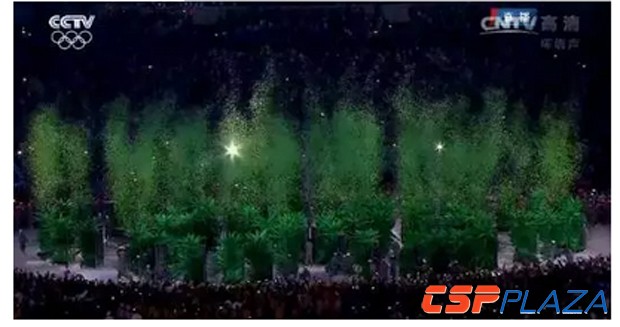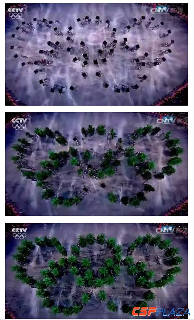 最終,鏡面“綻放”成了不分顏色,全是綠色的奧運五環。這是奧運五環絕無僅有在地面打開呈現,寓意是希望五大洲都被綠色所覆蓋,再次契合開幕式綠色環保的主題。
