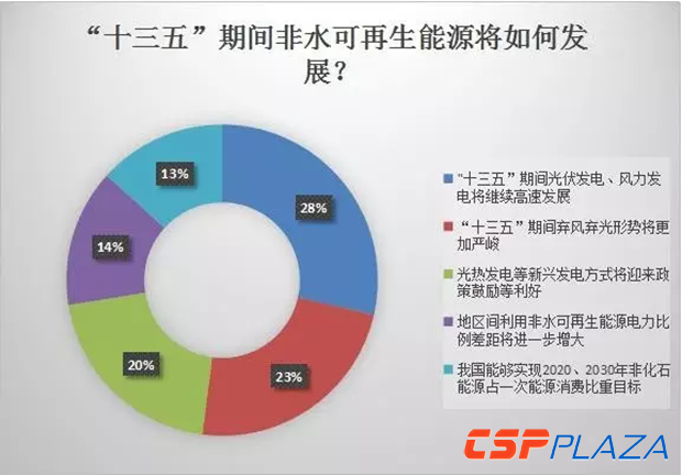 28%的受訪者認為,“十三五”期間光伏發電、風力發電將繼續高速發展;23%的受訪者認為,“十三五”期間棄風棄光形勢將更加嚴峻;20%的受訪者認為,光熱發電等新興發電方式將迎來政策鼓勵等利好;14%網友的受訪者認為,地區間利用非水可再生能源電力比例差距將進一步增大;13%的受訪者認為,我國能夠實現2020、2030年非化石能源占一次能源消費比重目標。